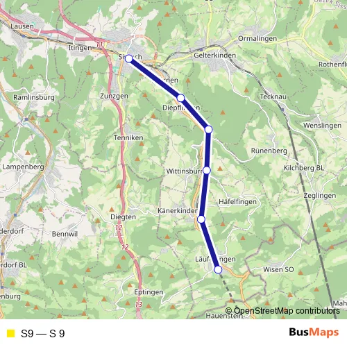 The first stop of the S9 rail route is Sissach and the last stop is Läufelfingen. S9 (S 9) is operational during täglich.