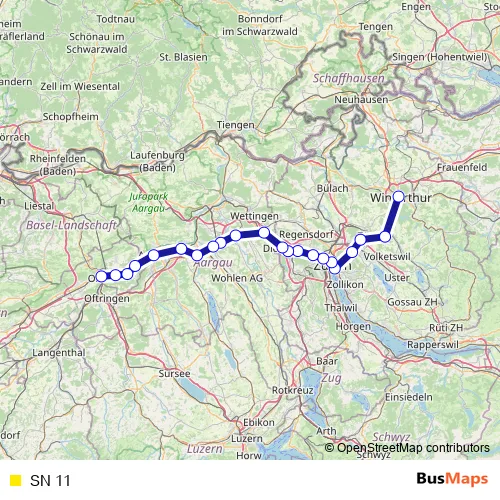 The first stop of the SN 11 rail route is Winterthur and the last stop is Olten. SN 11 is operational during am Wochenende.