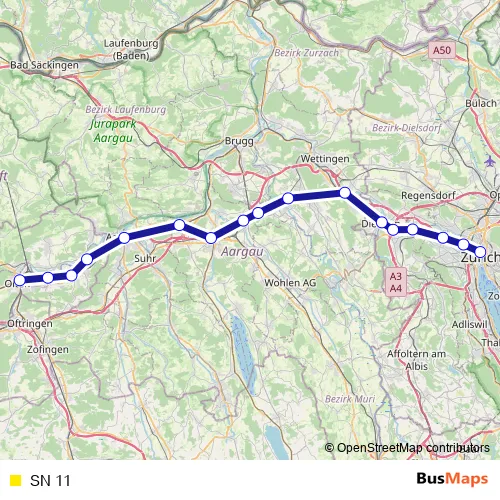 The first stop of the SN 11 rail route is Olten and the last stop is Zürich Hb. SN 11 is operational during am Wochenende.