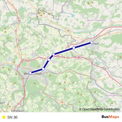 The first stop of the SN 30 rail route is Frauenfeld and the last stop is Winterthur. SN 30 is operational during am Wochenende.