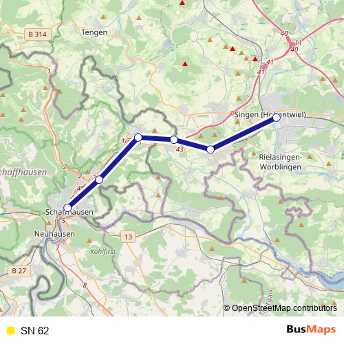 The first stop of the SN 62 rail route is Singen (Hohentwiel) and the last stop is Schaffhausen. SN 62 is operational during täglich.