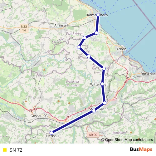 The first stop of the SN 72 rail route is Romanshorn and the last stop is