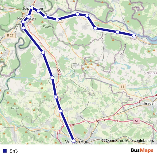 The first stop of the Sn3 rail route is Stein am Rhein and the last stop is Winterthur. Sn3 is operational during am Wochenende.