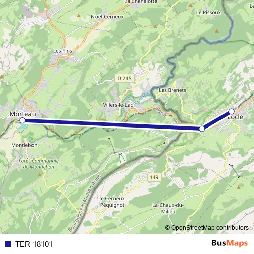 The first stop of the TER 18101 rail route is Le Locle and the last stop is Morteau. TER 18101 is operational during täglich.