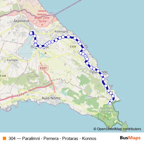 The first stop of the 304 bus route is Νέος Κεντρικός Σταθμός Αμμοχώστου and the last stop is Παραλία Κόννου 1. 304 (Παραλίμνι - Περνέρα - Πρωταράς - Κόννος) is operational during καθημερινά.