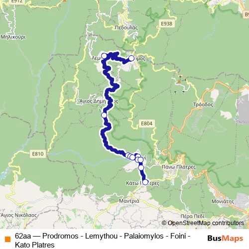 The first stop of the 62aa bus route is Κέντρο Προδρόμου 1 and the last stop is Κοινοτικό Συμβούλιο Κ. Πλατρών 2. 62aa (Πρόδρομος - Λεμύθου - Παλαιόμυλος - Φοινί - Κάτω Πλάτρες) is operational during τις καθημερινές.