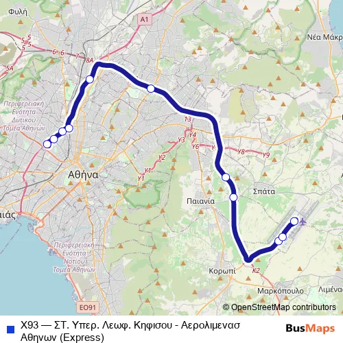 Click here to view the nearest Χ93 - ΣΤ. Υπερ. Λεωφ. Κηφισου - Αερολιμενασ Αθηνων (Express) bus stop.
