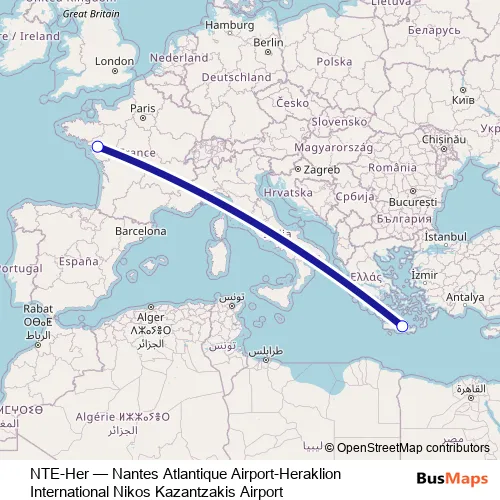 The first stop of the NTE-Her bus route is Aéroport de Heraklion and the last stop is Aéroport Nantes Atlantique. NTE-Her (Nantes Atlantique Airport-Heraklion International Nikos Kazantzakis Airport) is operational during καθημερινά.