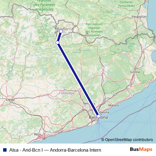 The first stop of the Alsa - And-Bcn I bus route is Andorra and the last stop is Barcelona (Nord). Alsa - And-Bcn I (Andorra-Barcelona Intern) is operational during everyday.