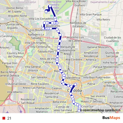 The first stop of the 21 bus route is Universidad Siglo 21 and the last stop is Av Cruz Roja 1300. 21 is operational during everyday.