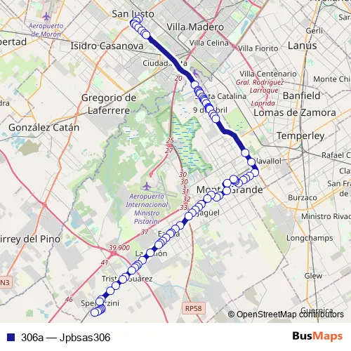 Doctor Ignacio Arieta - Avenida Brigadier General Juan Manuel de Rosas - Avenida Diego Armando Maradona - Padre Bachi - Ruta de la Tradición - Colón - Ruta de la Tradición - Camino de Cintura - Boulevard Buenos Aires - General Carlos Alvear - Eduardo Arana - Avenida Enrique Santamarina - Avenida Dardo Rocha - Dardo Rocha - Avenida Dardo Rocha - Dardo Rocha - Avenida Dardo Rocha - Avenida San Martín - El Trébol - Avenida San Martín - Regimiento de Patricios - Avenida San Martín - 25 de Mayo - Constancio Vigil - Italia
