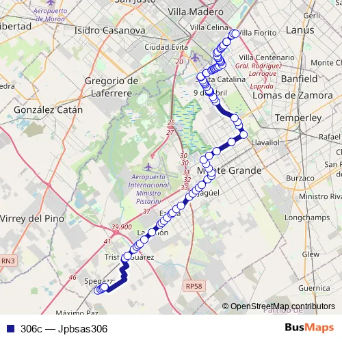 Presidente Juan Domingo Perón - Autopista Camino Negro - Presidente Juan Domingo Perón - Cosquín - Camino de la Ribera Sud - Isaac Newton - Epecuén - Avenida Juan Manuel de Rosas - Avenida Olimpo - Ruta de la Tradición - Coronel Álvaro Barros - Ruta de la Tradición - Avenida Luciano Valette - General José Rondeau - Avenida Luciano Valette - Avenida V. Fair - Antonio Cervetti - Avenida Dardo Rocha - Reconquista - Avenida San Martín - Los Sauces - Avenida San Martín - Regimiento de Patricios - Avenida San Martín - Cornelio Saavedra - Avenida San Martín - Constancio Vigil - Pedro de Mendoza - Constancio Vigil - Italia - Avenida San Martín