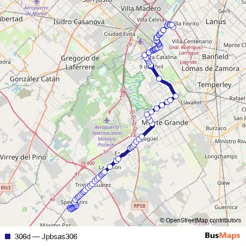 Cosquín - Camino de la Ribera Sud - Isaac Newton - Epecuén - Avenida Juan Manuel de Rosas - Avenida Olimpo - Ruta de la Tradición - Colón - Ruta de la Tradición - Avenida Luciano Valette - Avenida V. Fair - Antonio Cervetti - Avenida Dardo Rocha - Dardo Rocha - Avenida Dardo Rocha - Dardo Rocha - Avenida Dardo Rocha - Avenida San Martín - El Trébol - Avenida San Martín - Regimiento de Patricios - Avenida San Martín - 25 de Mayo - Constancio Vigil - Italia