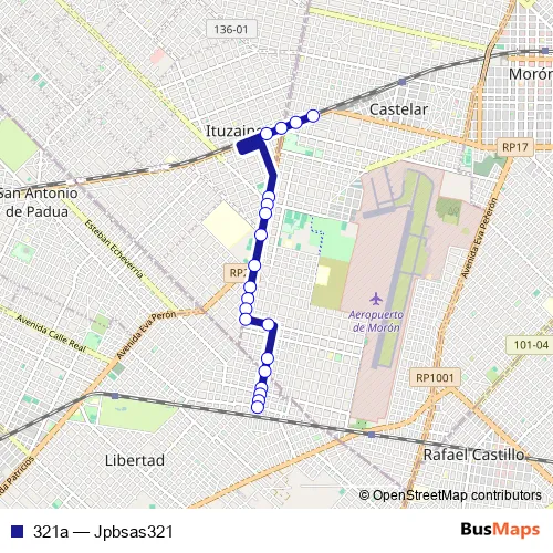 The first stop of the 321a bus route is Avenida Rivadavia 20952-21000 and the last stop is Helvecia 1931. 321a (Jpbsas321) is operational during everyday.