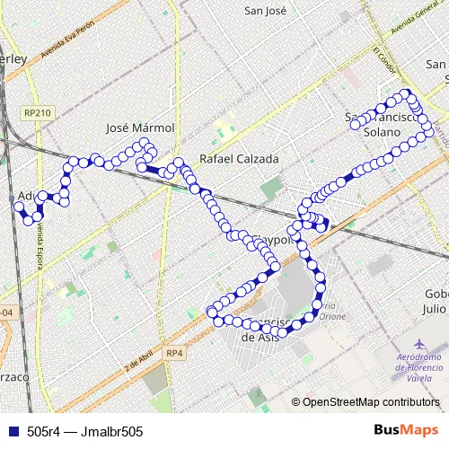 El Cóndor - Avenida Lirio - Anémona - Margarita - Azucena - Anémona - Cala - Domingo Salaberry - Begonia - Balboa - Domingo Salaberry - Irupé - Domingo Salaberry - Félix Lora - Francisco Bollini - Félix Lora - Domingo Salaberry - Monte Comán - Avenida 17 de Octubre - Remedios de Escalada de San Martín - José Hernández - Juan José Paso - Avenida Eva Perón - Avenida Monteverde - Avenida Lacaze - Garibaldi - Marconi - Uruguay - Camilo Cavour - Agüero - Juan Azopardo - Agüero - Altamira - Cervantes Saavedra - Altamira - Avenida General San Martín - José Murature - Venancio Flores - José Ferré - Hipólito Bouchard - 25 de Mayo - Leonardo Rosales - Guillermo Granville - Leonardo Rosales - Roque Sáenz Peña - Jorge Santiago Bynnon - 4 de Enero - Bartolomé Mitre