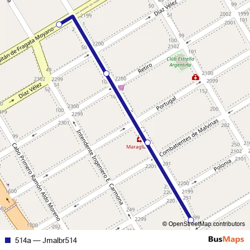 The first stop of the 514a bus route is Enrique Policastro 2099-2199 and the last stop is Almte Seguí 2249. 514a (Jmalbr514) is operational during everyday.