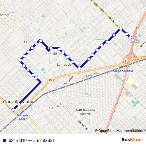 The first stop of the 621rnd10 bus route is Avenida Juan Bautista Lasalle 4238 and the last stop is Metrobus Intendente Federico Russo. 621rnd10 (Jmlmtz621) is operational during everyday.