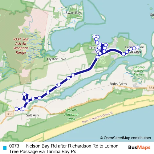 The first stop of the 0073 bus route is Nelson Bay Rd After Richardson Rd and the last stop is Meredith Av At Cook Pde. 0073 (Nelson Bay Rd after Richardson Rd to Lemon Tree Passage via Tanilba Bay Ps) is operational during on weekdays.