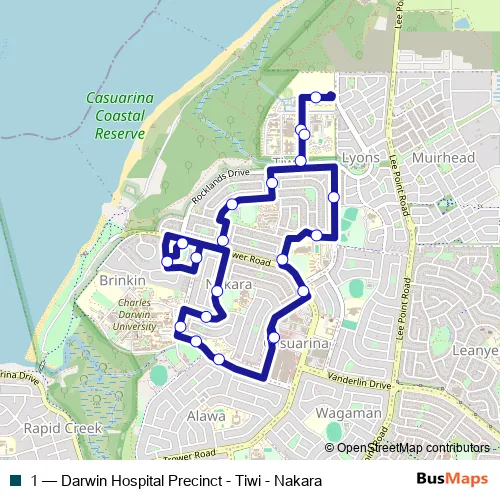 The first stop of the 1 bus route is Casuarina Interchange and the last stop is Casuarina Terminus. 1 (Darwin Hospital Precinct - Tiwi - Nakara) is operational during everyday.