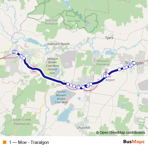 The first stop of the 1 bus route is Moe Bus Interchange/Albert St and the last stop is Traralgon Plaza SC/Franklin St. 1 (Moe - Traralgon) is operational during everyday.