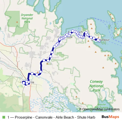 The first stop of the 1 bus route is Shute Harbour and the last stop is Mill St at Proserpine. 1 (Proserpine - Canonvale - Airle Beach - Shute Harb) is operational during everyday.