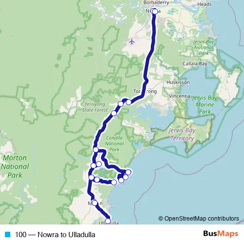 The first stop of the 100 bus route is Nowra Bus Terminal, Stewart Pl and the last stop is Princes Hwy After Wason St. 100 (Nowra to Ulladulla) is operational during on weekdays.