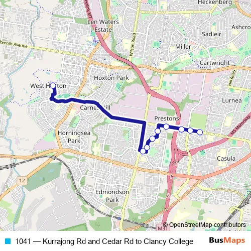 The first stop of the 1041 bus route is Kurrajong Rd After Cedar Rd and the last stop is Clancy College, Carmichael Dr. 1041 (Kurrajong Rd and Cedar Rd to Clancy College) is operational during on weekdays.