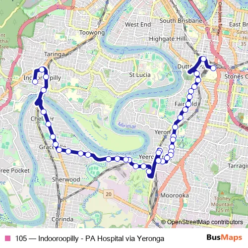 The first stop of the 105 bus route is PA Hospital station, platform 2 and the last stop is Indooroopilly interchange. 105 (Indooroopilly - PA Hospital via Yeronga) is operational during everyday.