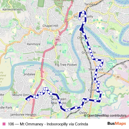 The first stop of the 106 bus route is Mount Ommaney Shopping Centre and the last stop is Indooroopilly interchange. 106 (Mt Ommaney - Indooroopilly via Corinda) is operational during everyday.