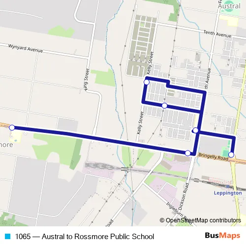 The first stop of the 1065 bus route is Edmondson Av After Bringelly Rd and the last stop is Rossmore Public School, Bringelly Rd. 1065 (Austral to Rossmore Public School) is operational during on weekdays.