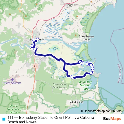 The first stop of the 111 bus route is Bomaderry Station and the last stop is Orient Point Community Pre School. 111 (Bomaderry Station to Orient Point via Culburra Beach and Nowra) is operational during everyday.