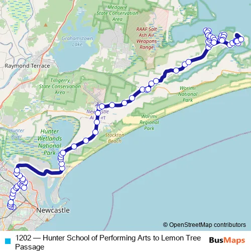 The first stop of the 1202 bus route is Hunter School Of The Performing Arts, Lambton Rd and the last stop is Meredith Av At Cook Pde. 1202 (Hunter School of Performing Arts to Lemon Tree Passage) is operational during on weekdays.