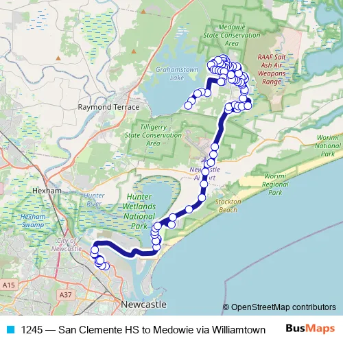 The first stop of the 1245 bus route is San Clemente High School, Crebert St and the last stop is Grahamstown Rd At Wade Cl. 1245 (San Clemente HS to Medowie via Williamtown) is operational during on weekdays.