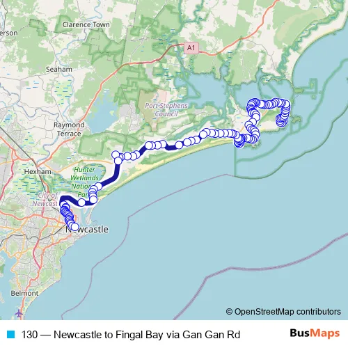Bus 130 - Newcastle to Fingal Bay via Gan Gan Rd in Newcastle: Stops & Timetable