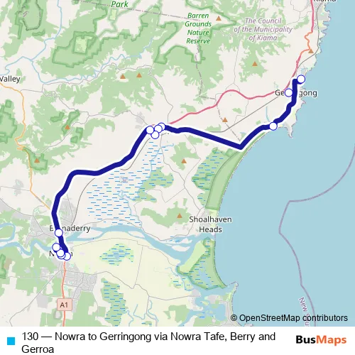 The first stop of the 130 bus route is Pacific Av Opp Werri Beach Fish Shop and the last stop is Shoalhaven Hospital, Shoalhaven St. 130 (Nowra to Gerringong via Nowra Tafe, Berry and Gerroa) is operational during everyday.