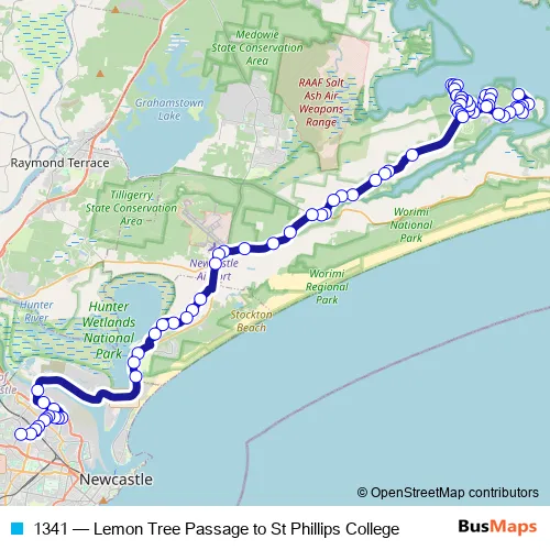 The first stop of the 1341 bus route is Meredith Av Opp Kenneth Pde and the last stop is Waratah Public School, High St. 1341 (Lemon Tree Passage to St Phillips College) is operational during on weekdays.