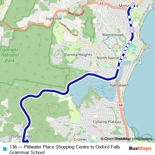 Bus 136 - Pittwater Place Shopping Centre to Oxford Falls Grammar School in Sydney: Stops & Timetable