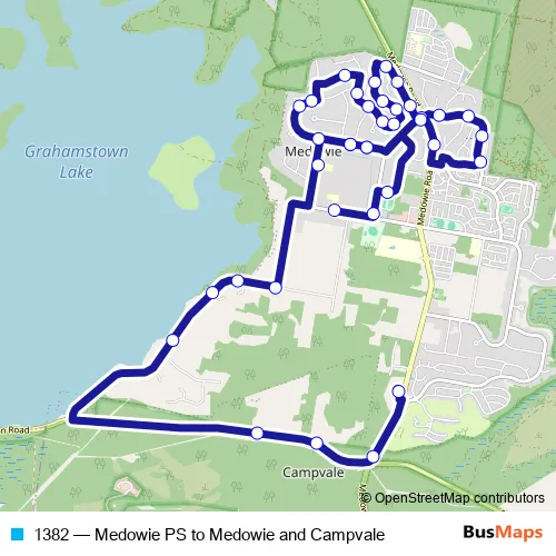 The first stop of the 1382 bus route is Medowie Primary School, Ferodale Rd and the last stop is Catherine Mcauley College, Bus Stop B. 1382 (Medowie PS to Medowie and Campvale) is operational during on weekdays.