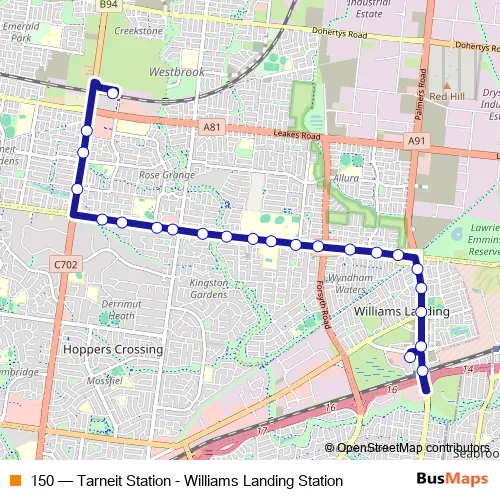 The first stop of the 150 bus route is Williams Landing Station and the last stop is Tarneit Station. 150 (Tarneit Station - Williams Landing Station) is operational during everyday.