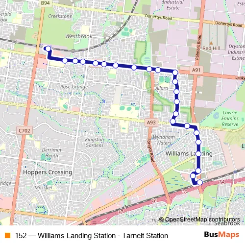 The first stop of the 152 bus route is Williams Landing Station and the last stop is Tarneit Station. 152 (Williams Landing Station - Tarneit Station) is operational during everyday.