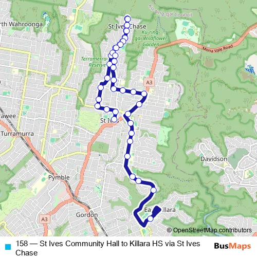 The first stop of the 158 bus route is St Ives Community Hall, Memorial Av and the last stop is Killara High School, Koola Av. 158 (St Ives Community Hall to Killara HS via St Ives Chase) is operational during on weekdays.