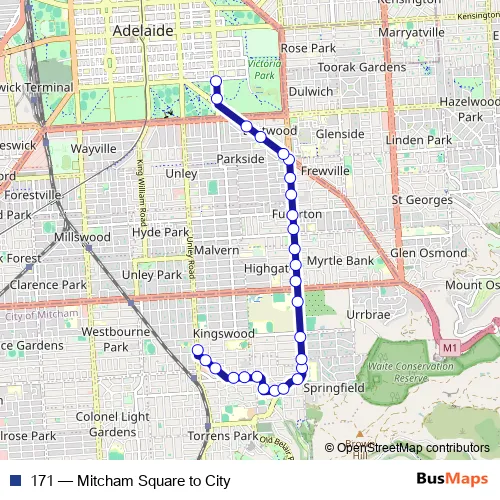 The first stop of the 171 bus route is Stop 12 Belair Rd - East side and the last stop is Stop O3 Hutt Rd - West side. 171 (Mitcham Square to City) is operational during everyday.