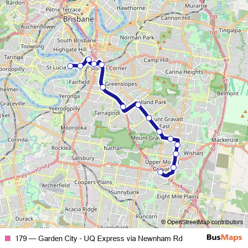 The first stop of the 179 bus route is UQ Lakes stop D and the last stop is Garden City Shopping Centre station. 179 (Garden City - UQ Express via Newnham Rd) is operational during everyday.