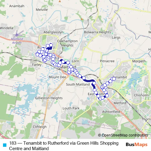 Bus 183 - Tenambit to Rutherford via Green Hills Shopping Centre and Maitland in Maitland: Stops & Timetable