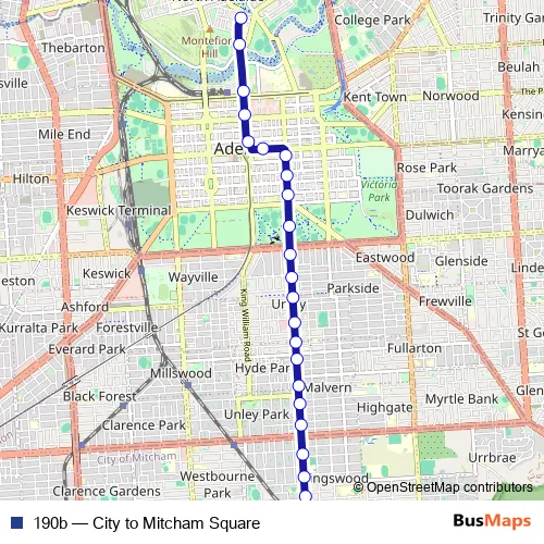 The first stop of the 190b bus route is Stop 2 King William Rd - South East side and the last stop is Stop 12 Belair Rd - East side. 190b (City to Mitcham Square) is operational during everyday.