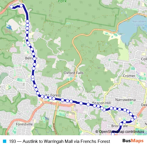 The first stop of the 193 bus route is Warringah Mall, Green St and the last stop is Austlink Business Park, Narabang Way. 193 (Austlink to Warringah Mall via Frenchs Forest) is operational during everyday.