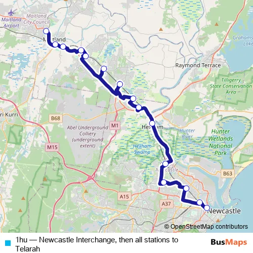 The first stop of the 1hu bus route is Newcastle Interchange, Stand C and the last stop is Telarah Station, Johnson St. 1hu (Newcastle Interchange, then all stations to Telarah) is operational during everyday.