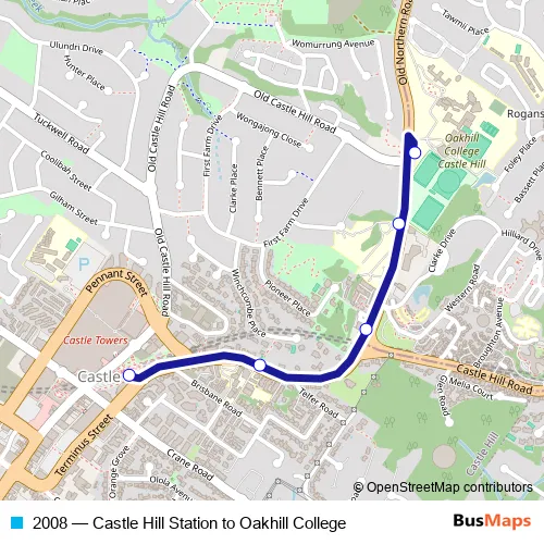 The first stop of the 2008 bus route is Castle Hill Station, Old Northern Rd, Stand A and the last stop is Oakhill College, Old Northern Rd. 2008 (Castle Hill Station to Oakhill College) is operational during on weekdays.