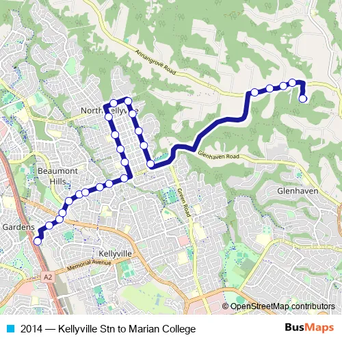 The first stop of the 2014 bus route is Kellyville Station, Guragura St, Stand C and the last stop is Marian Catholic College, School Grounds. 2014 (Kellyville Stn to Marian College) is operational during on weekdays.