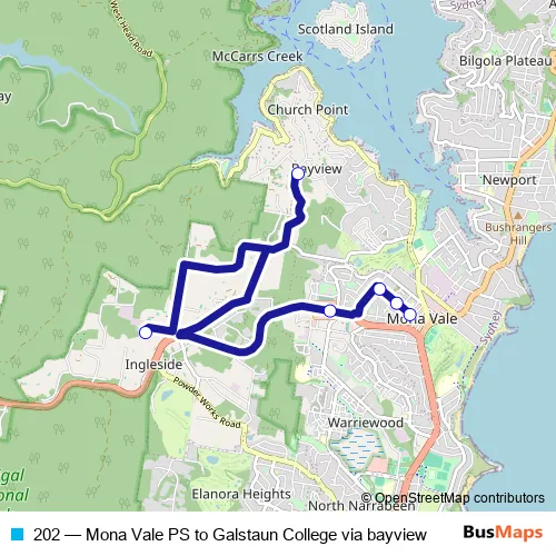 Click here to view the nearest 202 - Mona Vale PS to Galstaun College via bayview bus stop.